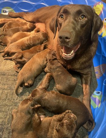 We just welcomed her first litter of puppies. So far, Etta is an exellent mother of all chocolate puppies.